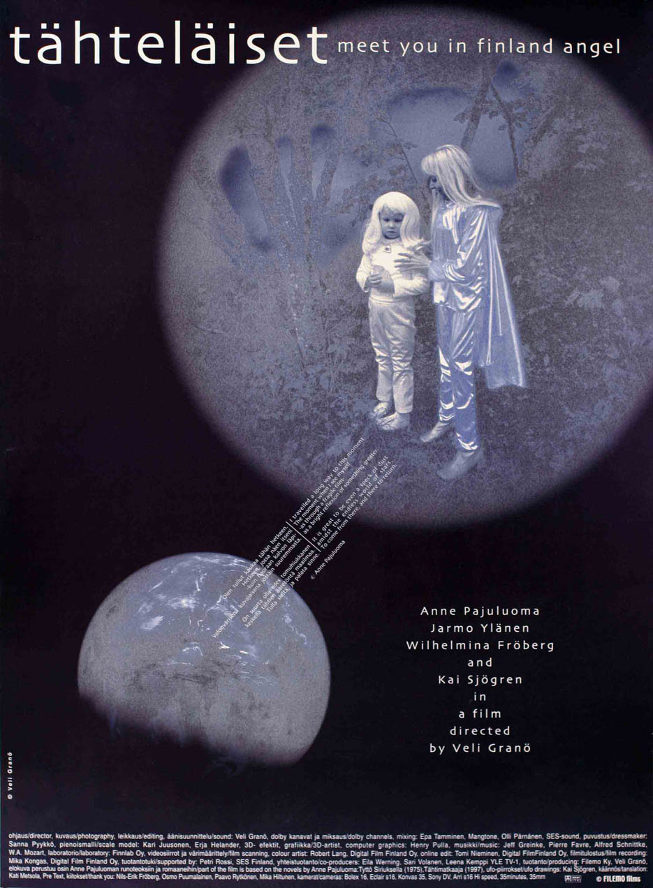 the story of Anne Pajuluoma and Jarmo Ylänen little Mira: Wilhelmina Fröberg angel, UFO –drawings: Kai Sjögren costumes: Sanna Pyykkö scale model: Kari Juusonen, Erja Helander 3D-artist, digital compositor: Henry Pulla music: Jeff Greinke, Pierre Favre, And the Lefthanded, W.A. Mozart mixing: Epa Tamminen, Olli Pärnänen, SES-sound colour artist: Robert Lang, Digital Film Finland Oy online edit: Tomi Nieminen, Digital Film Finland Oy print: Mika Kongas, Digital Film Finland Oy, Timo Nousiainen, Finnlab Oy laboratory: Finnlab Oy cinematography, editing, sound, director Veli Granö supported by: Petri Rossi, Finnish Film Foundation, SES co-producers: Eila Werning Sari Volanen Leena Kemppi, Yle, TV-1 festival contribute, print source: Marja Pallassalo